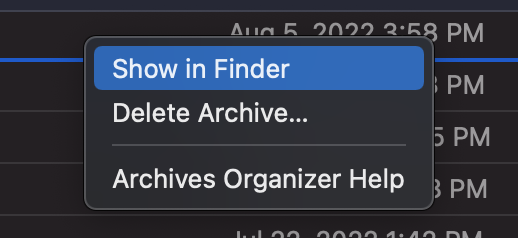 2. Organizer에서 Archive 우클릭 -> Show in Finder