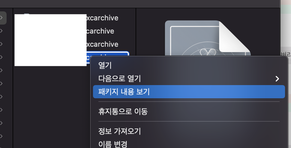 3. Finder에서 Archive 파일 우클릭 -> 패키지 내용 보기