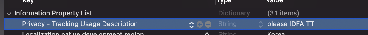info.plist에 요청 문구를 적어줘야하며, ( Privacy - Tracking Usage Description )