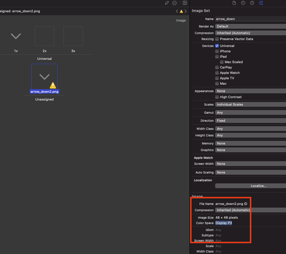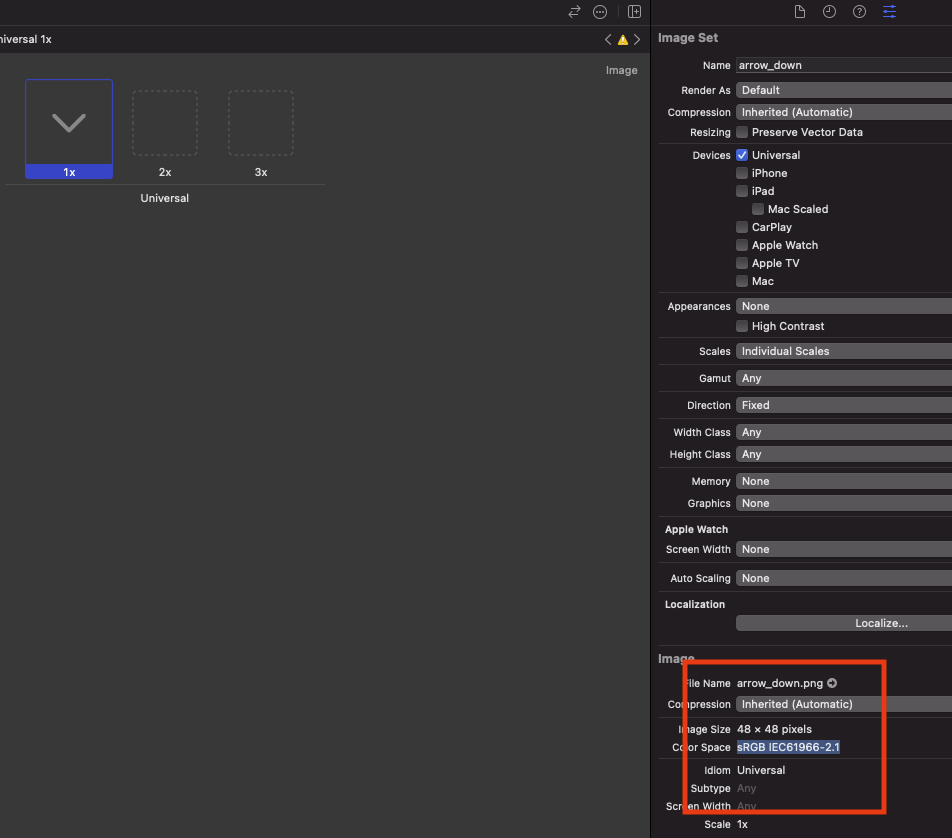 7. 에셋카탈로그(.xcassets)에서 이미지의 ColorSpace 보기.