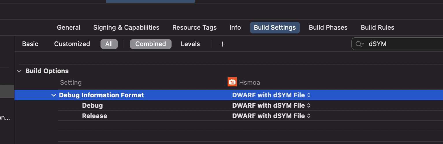 - Debug Information Format에서 Debug, Release 모두 DWARF with dSYM File을 선택.