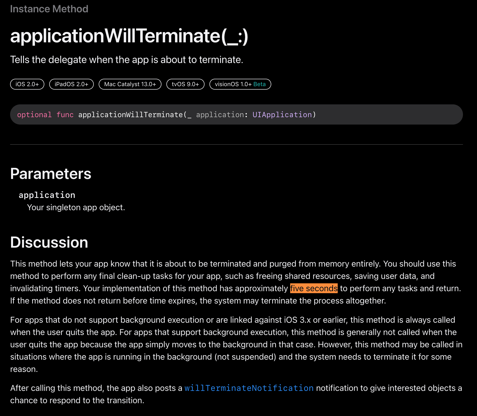 - UIKit > UIApplication.h > applicationWillTerminate 을 가지고 앱 종료 직전을 컨트롤할 수 있음.