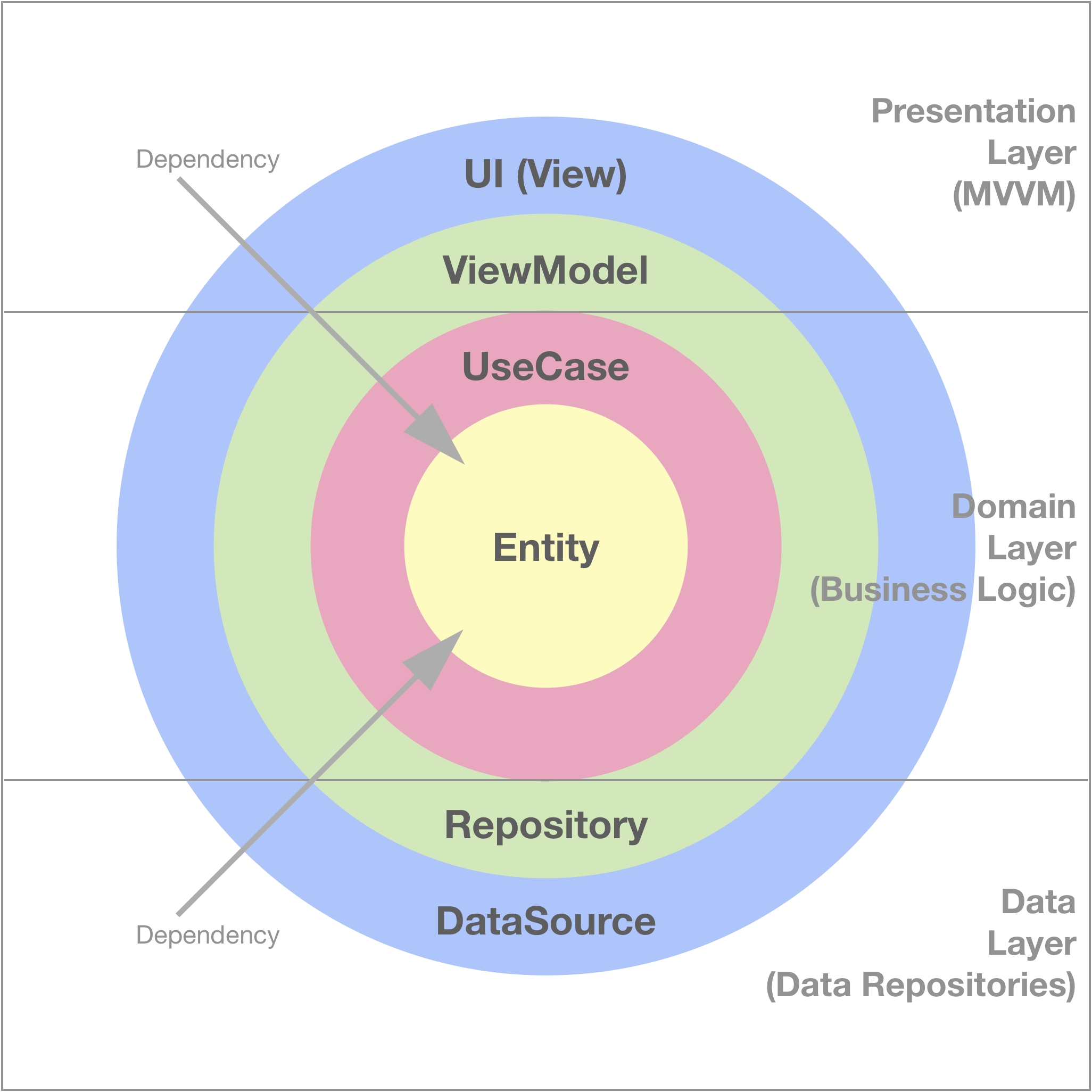 - 의존성을 바깥쪽에서 안쪽으로 주입 (바깥쪽이 변경되어도, 안쪽이 변경될 필요 없게. )