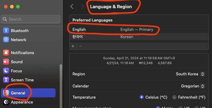 - 설정 -> 일반 -> 언어 & 지역 -> 시스템 언어를 영어로 변경