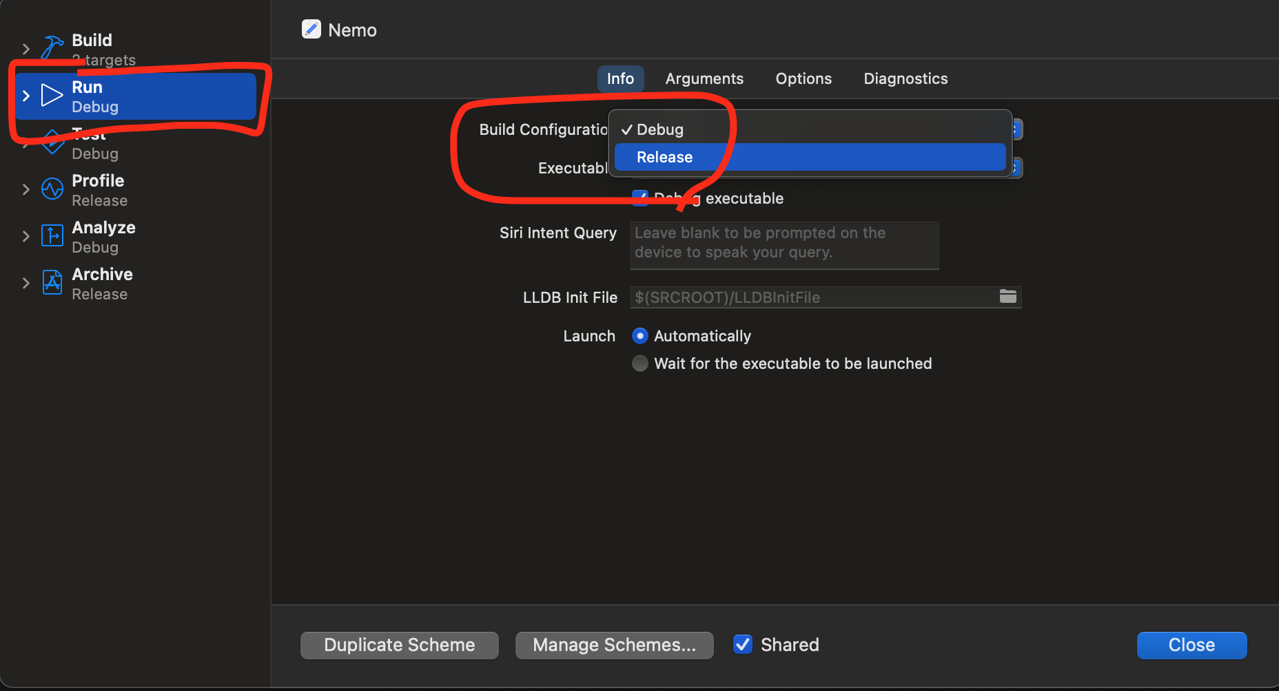 - Run -> Info -> Build Configuration -> Release 로 변경