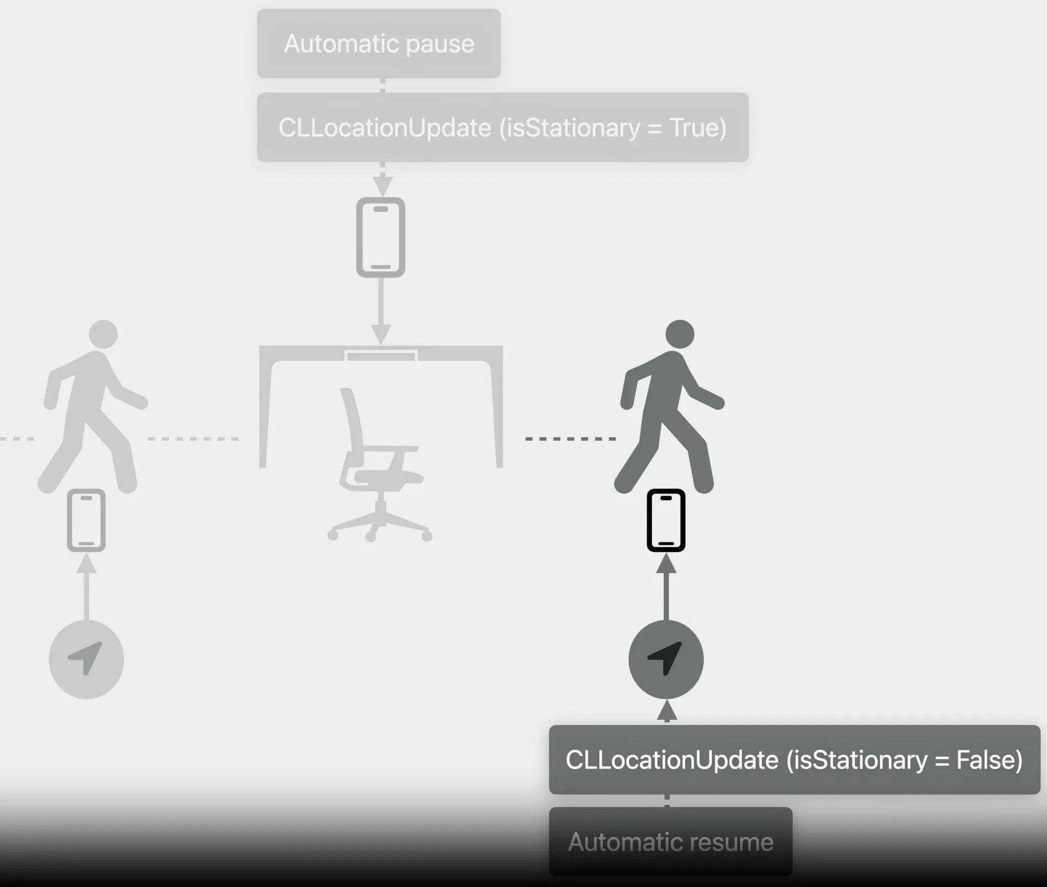 - 기기가 오랫동안 제자리에 있을 경우, CLLocationUpdate API가 이를 인식하고 Automatic Pause를 작동