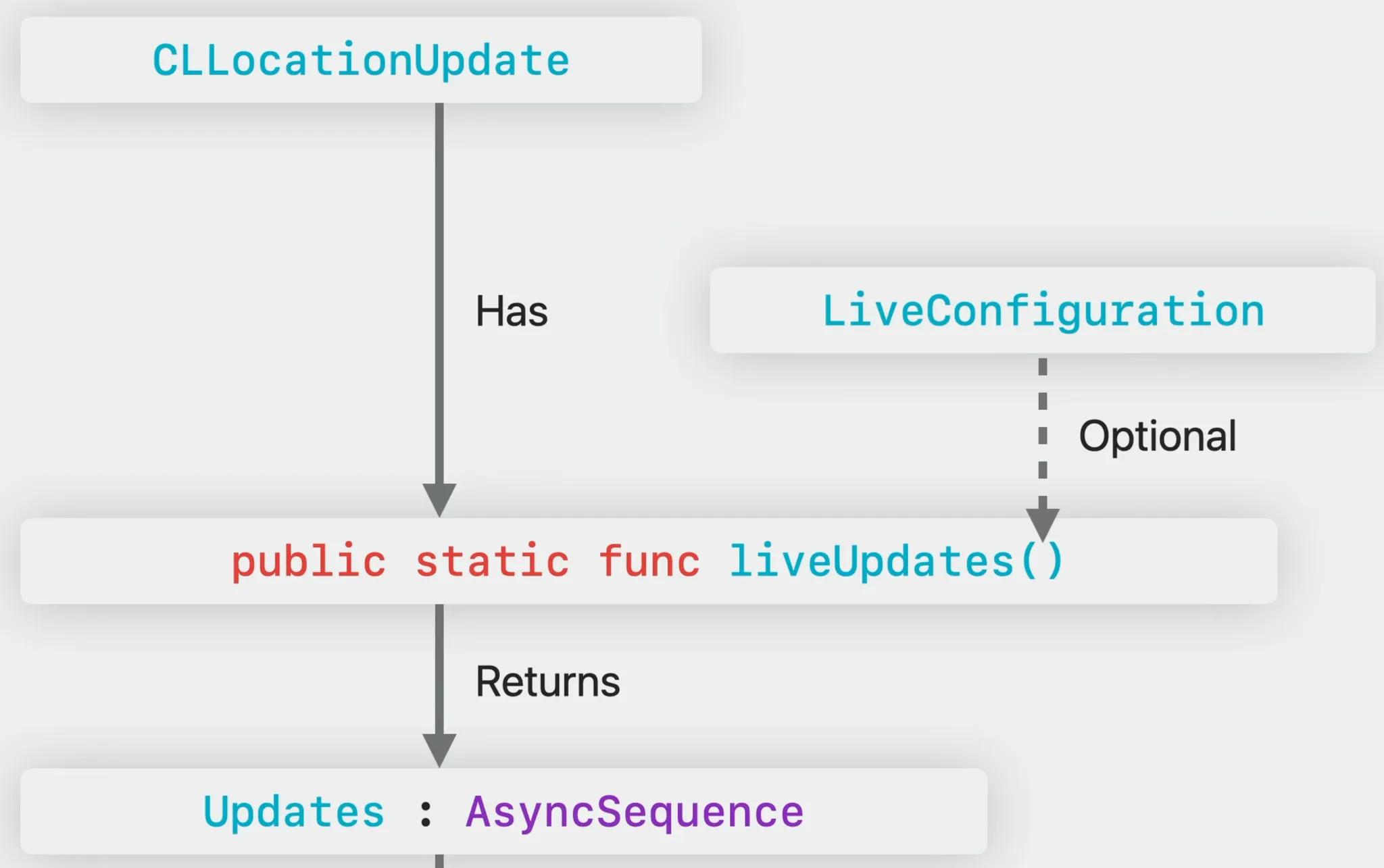 - CLLocationUpdate 클래스는 liveUpdates()라는 비동기 시퀀스를 반환하는 정적 메소드를 가짐