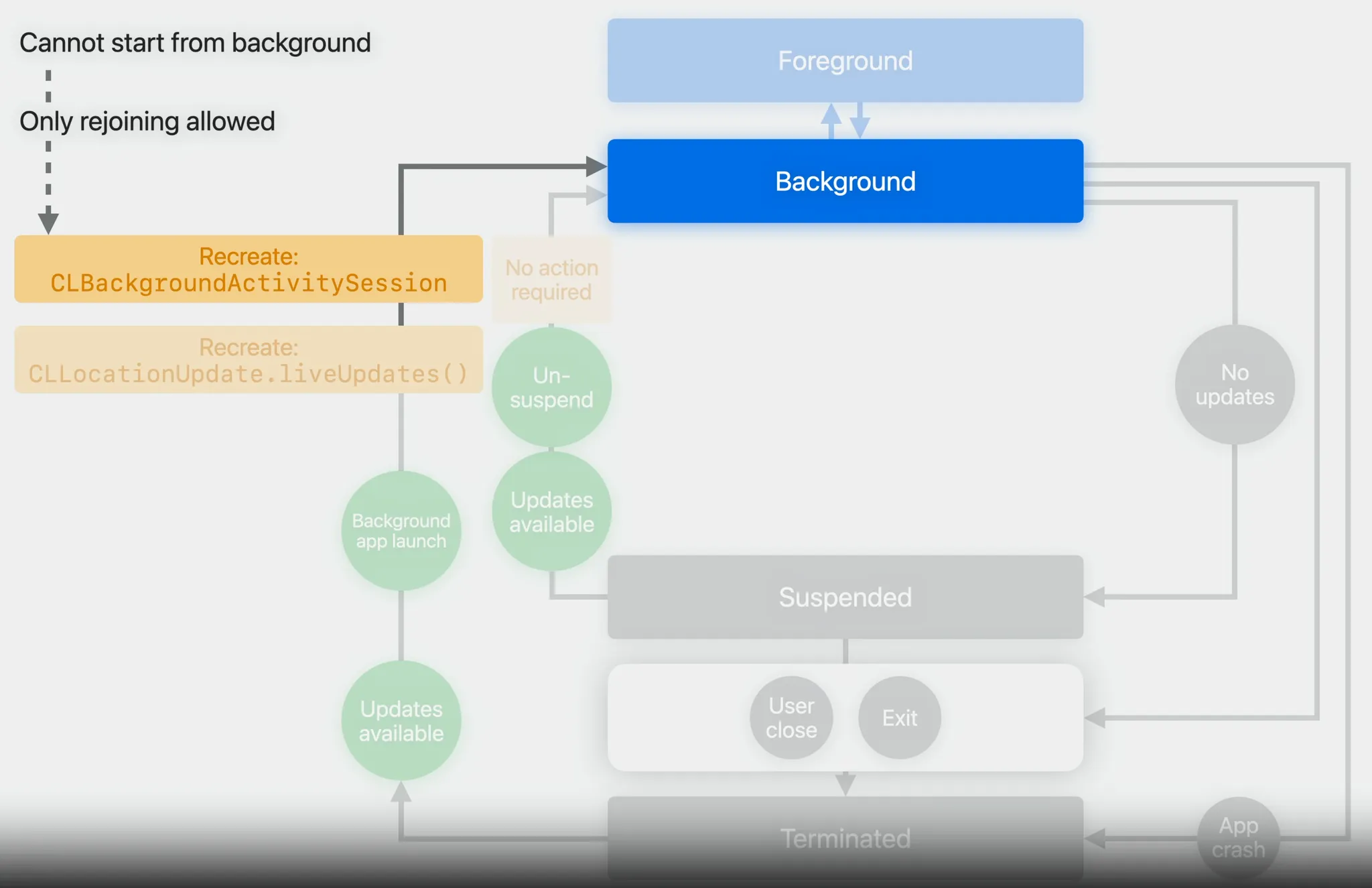 import CoreLocation // 새로운 세션 시작 self.backgroundActivity = CLBackgroundActivitySession() let updates = CLLocationUpdate.liveUpdates() for try await update in updates { print("My current location : \\(update.location)") } // 세션 종료 self.backgroundActivity.invalidate() // 객체 릴리즈시에도 종료