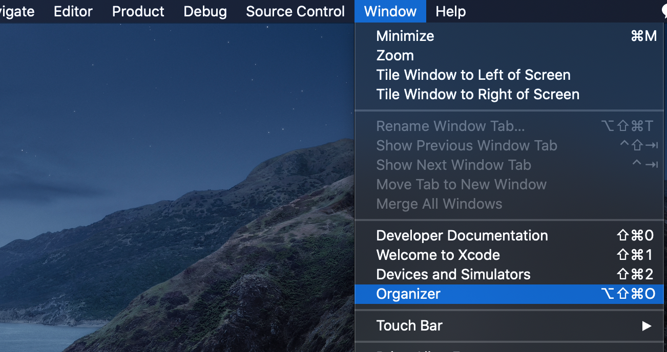 1. 상단바 이용하기 : Xcode -> Window -> Organizer