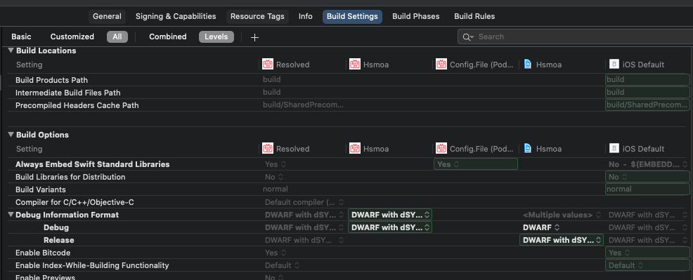 Xcode의 Build Settings에서 Levels를 눌러보시면 이런 화면을 보실 수 있는데,