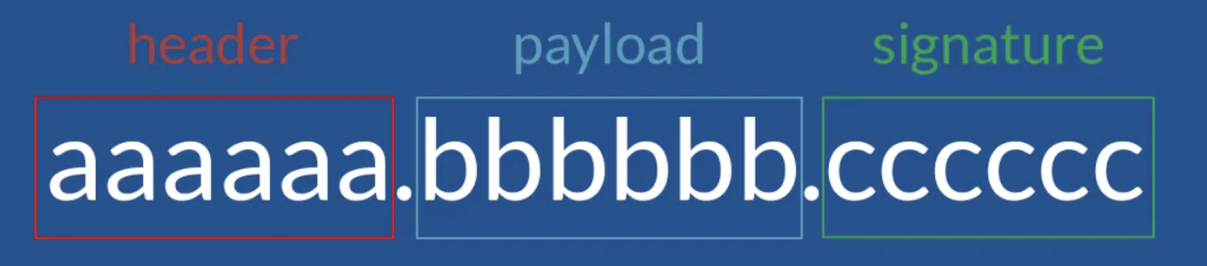 header + "." + payload + "." + signature = eyJhbGciOiJIUzI1NiIsInR5cCI6IkpXVCJ9.eyJzdWIiOiIxMjM0NTY3ODkwIiwibmFtZSI6IkpvaG4gRG9lIiwiaWF0IjoxNTE2MjM5MDIyfQ.PcmVIPbcZl9j7qFzXRAeSyhtuBnHQNMuLHsaG5l804A