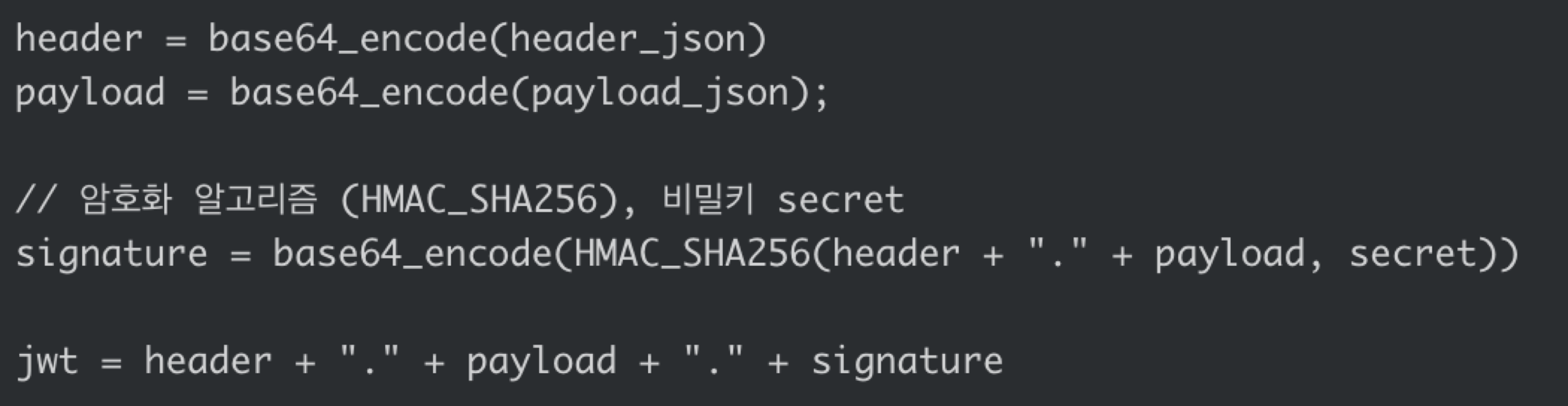 두 데이터를 JSON으로 만들고, URL-safe BASE64 인코딩하면 완성